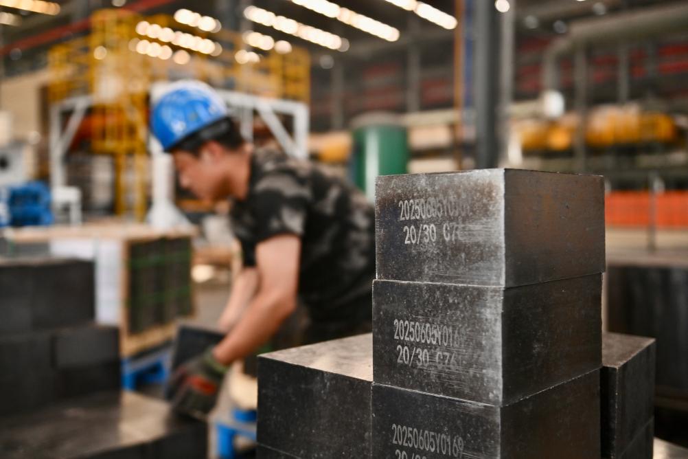 6月6日,工人在海城利尔麦格西塔材料有限公司搬运钢包镁碳砖。 新华社记者 吴青昊 摄