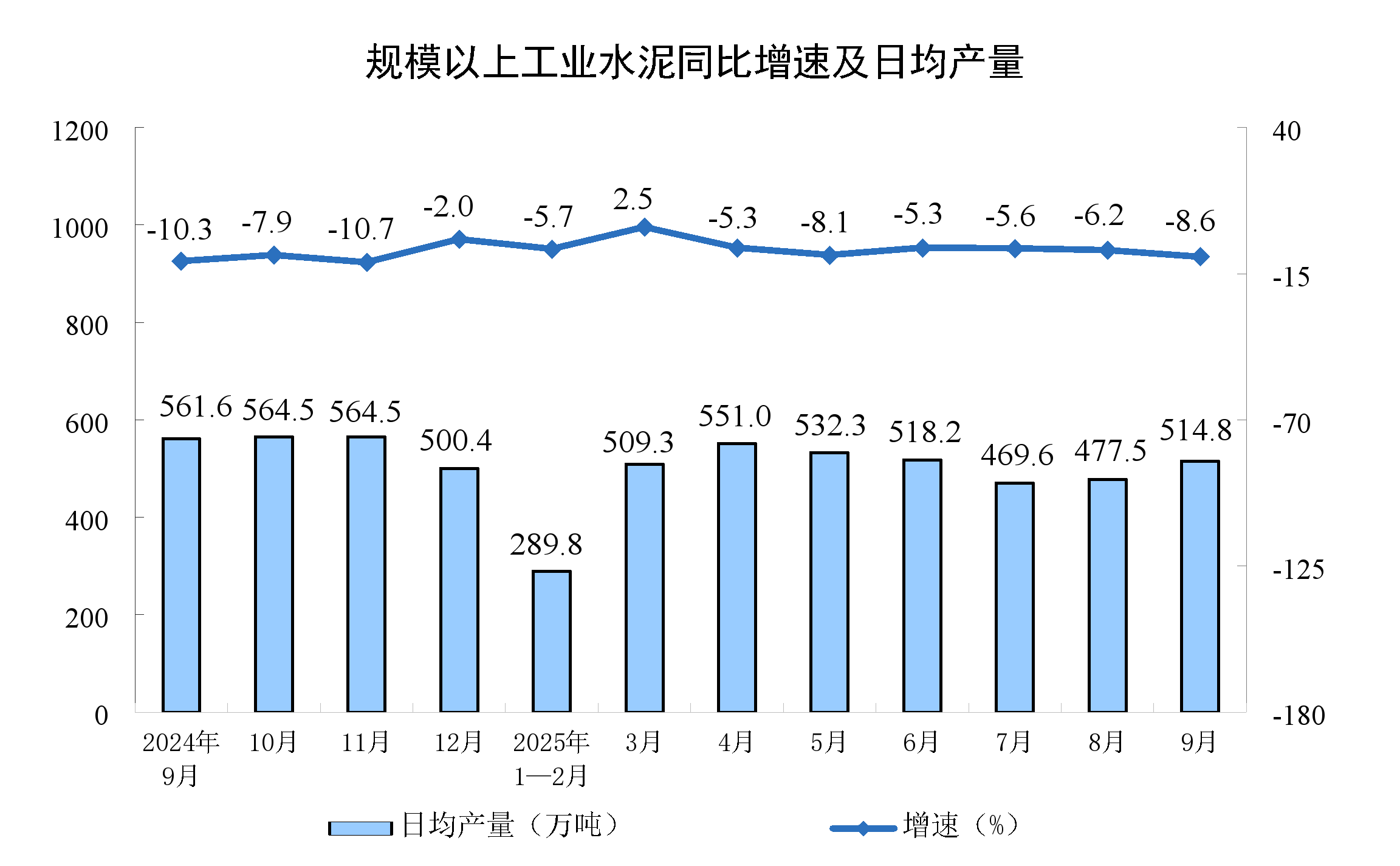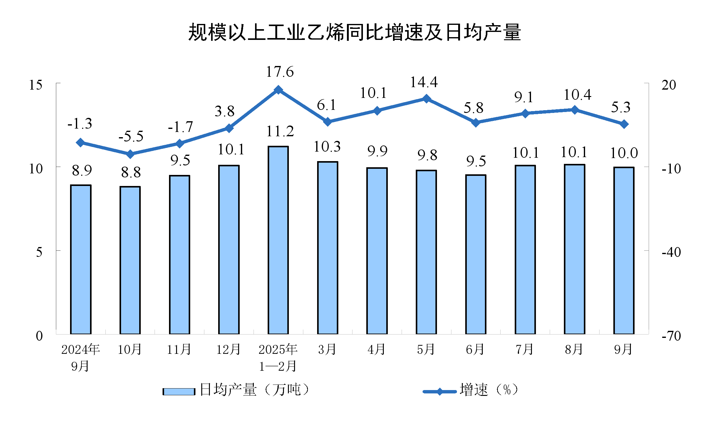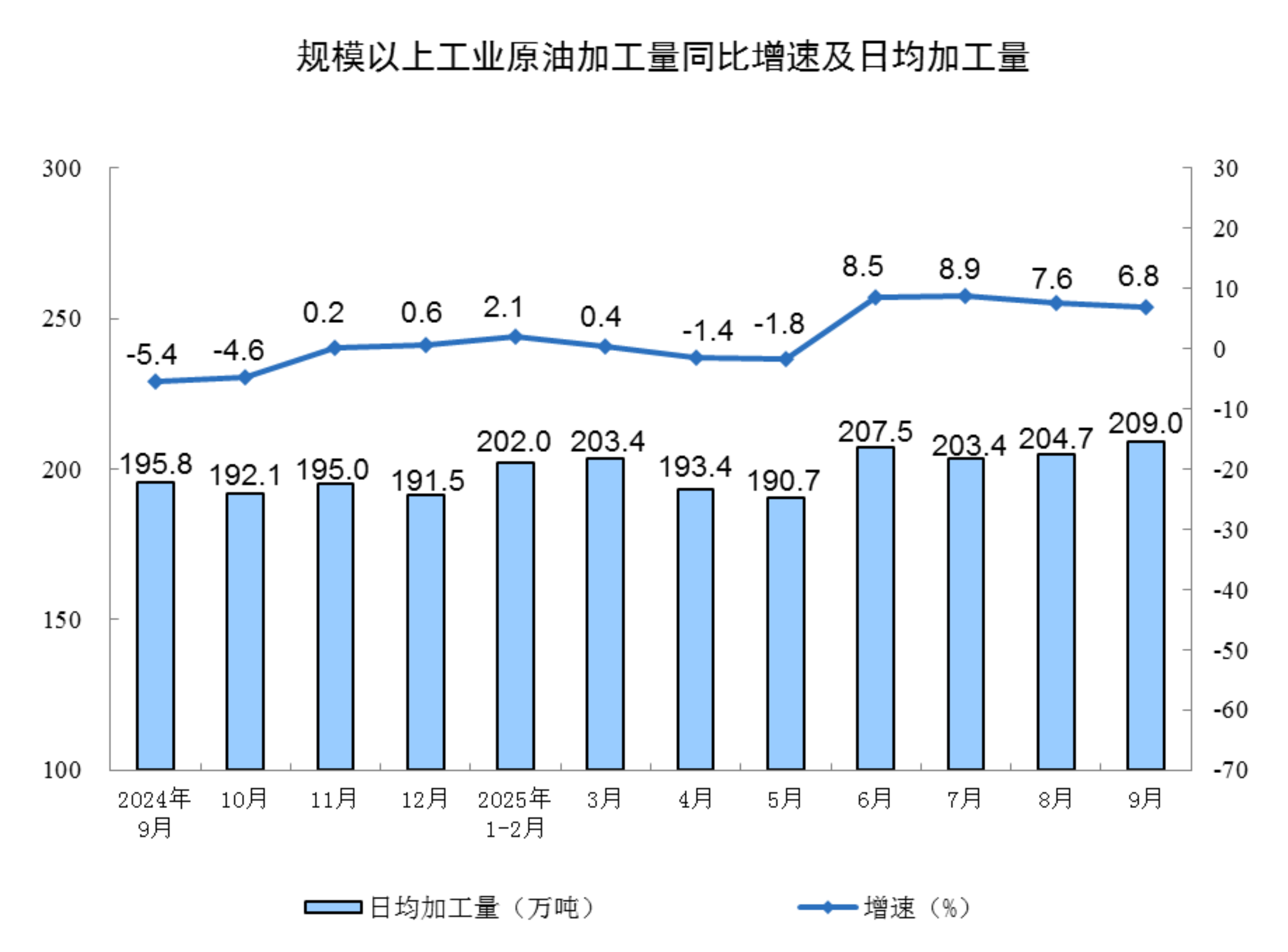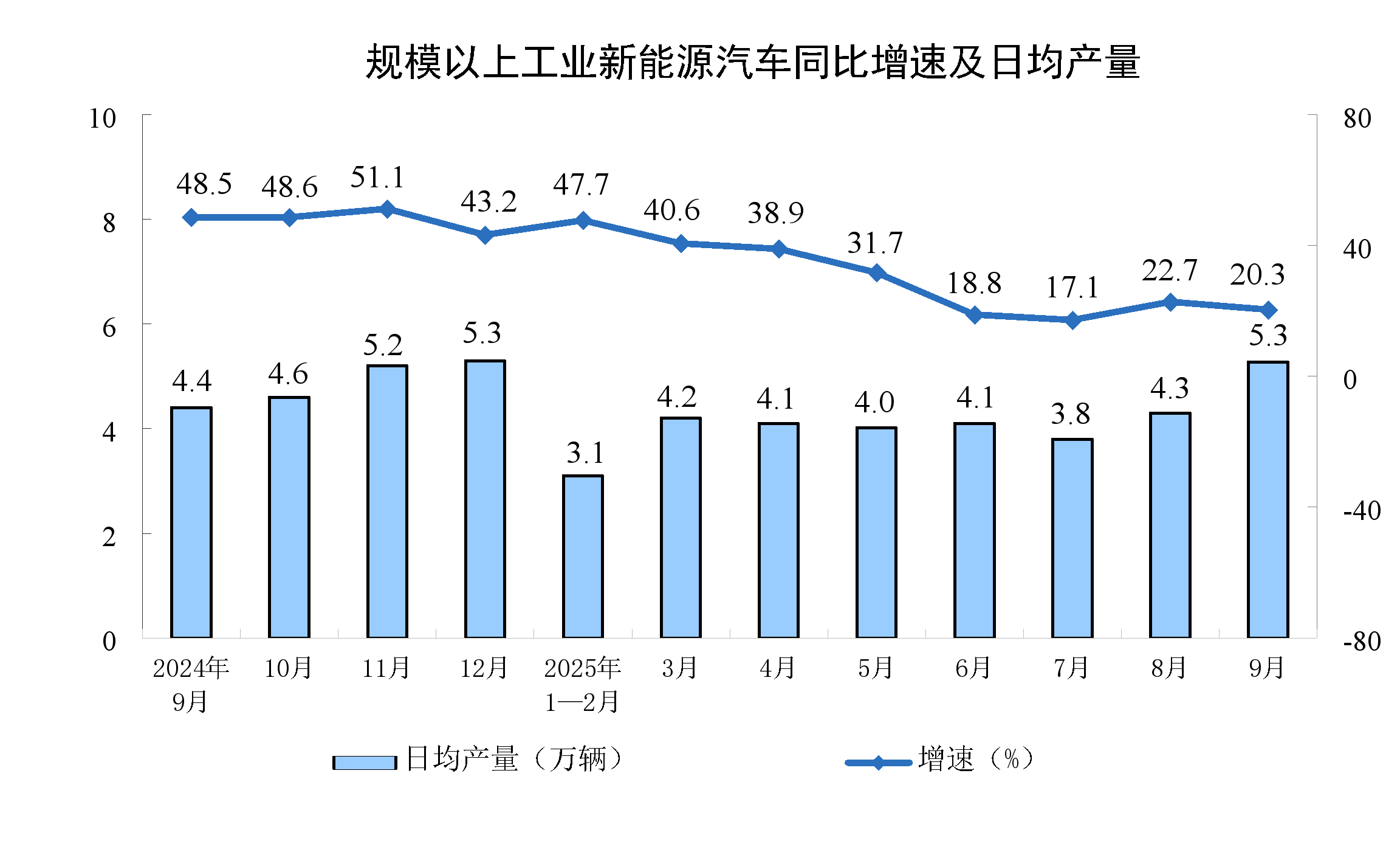 分产品看,9月份,规模以上工业623种产品中有362种产品产量同比增长。其中,钢材12421万吨,同比增长5.1%;水泥15444万吨,下降8.6%;十种有色金属695万吨,增长2.9%;乙烯299万吨,增长5.3%;汽车322.7万辆,增长13.7%,其中新能源汽车158.0万辆,增长20.3%;发电量8262亿千瓦时,增长1.5%;原油加工量6269万吨,增长6.8%。