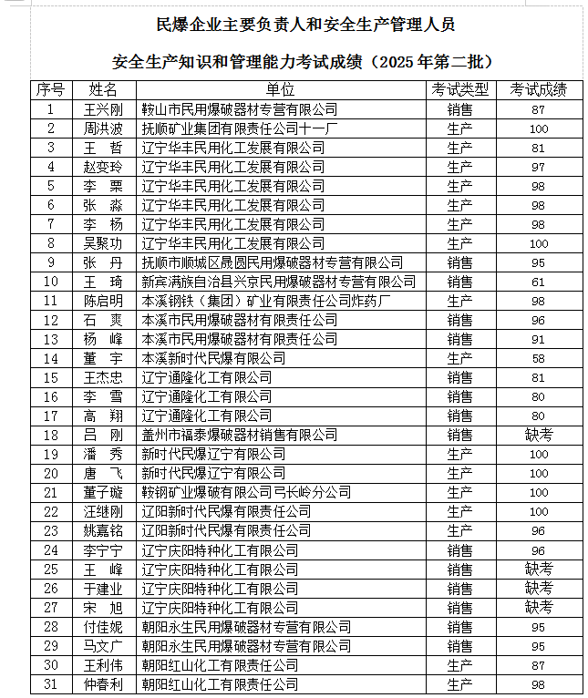 10月14日,我厅组织了民爆行业安全生产知识和管理能力考试(2025年第二批),现将考试成绩公示如下: